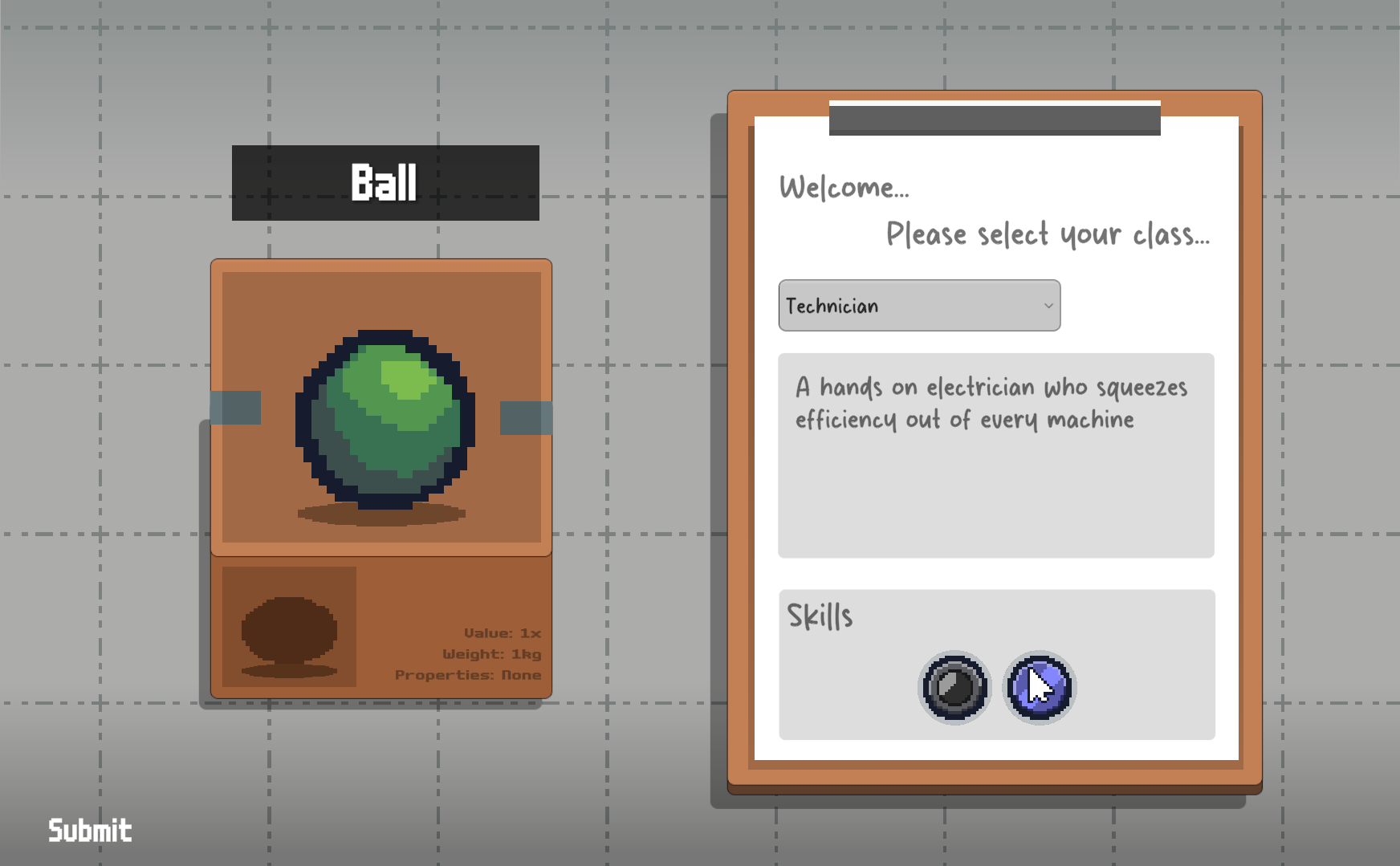 Each game begins with a ball dropping from a spawner. The player must place and connect different mechanical parts to guide the ball across the map. As the ball moves, it gains value from tricks, combos, and the time is has remained alive. The player must design their world to maximize these values to unlock more elaborate and sophisticated machines. With increasing ball values, the player will unlock new machines to expand upon their system, allowing the player to push their designs further than ever.